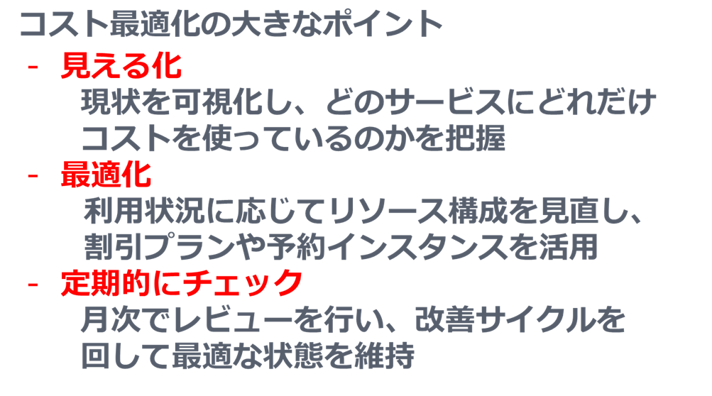AWSのコスト管理は、「可視化」「最適化」「定期チェック」という3つの柱で考えると整理しやすくなります。