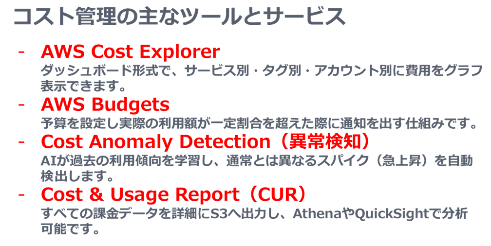 コストの可視化ができていないと、「どのシステムがどれくらいの費用を使っているのか」が見えづらくなり、経費精算や予算管理が複雑化してしまいます。そこで、AWSではコストを可視化するためのさまざまなツールが用意されています。