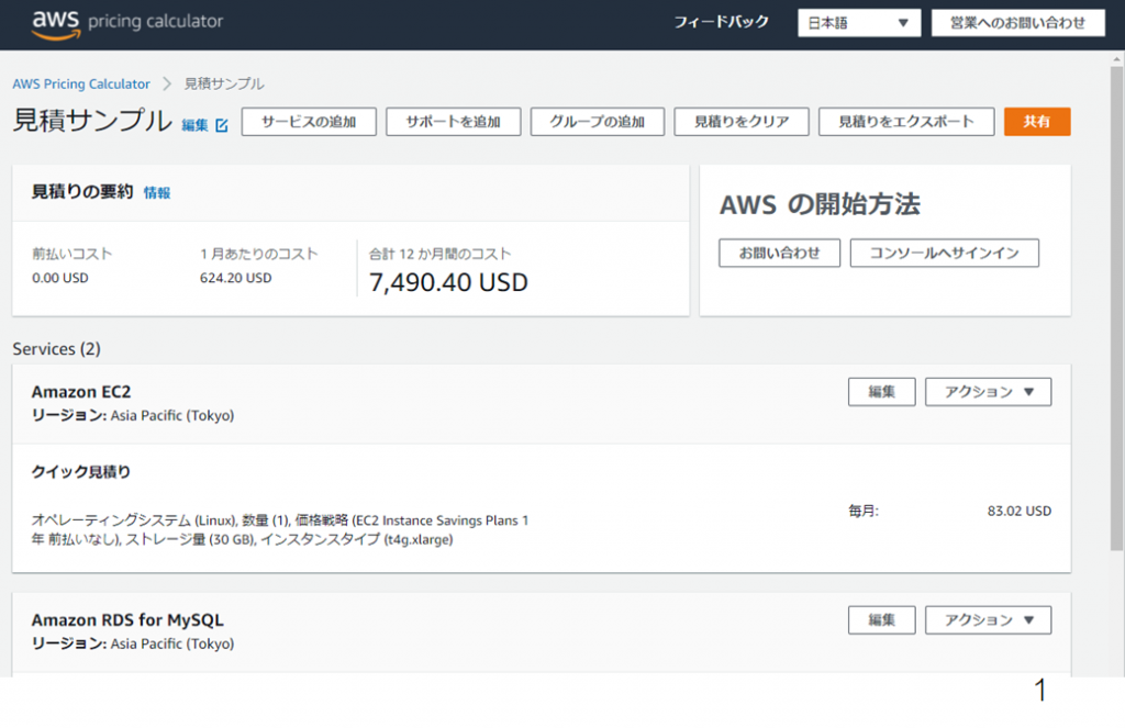 AWSでは公式で簡易見積もりツールが用意されています。こちら(https://calculator.aws/#/)にアクセスすると、起動できます。見積もりはサービスごとに行います。複数のサービスは最終的に合算することもできます。