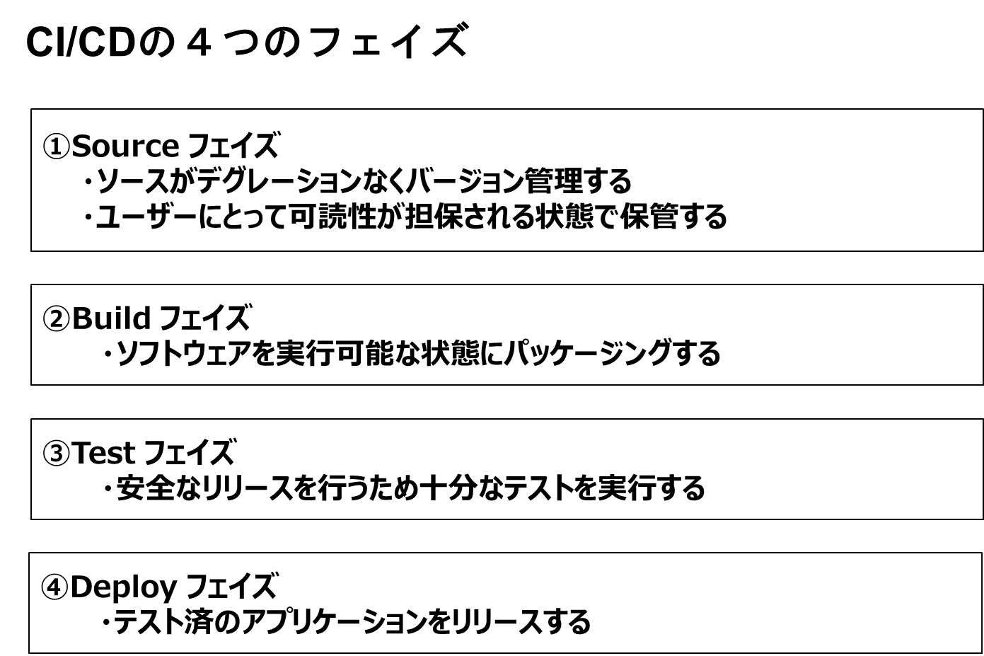 - CI(継続的インテグレーション)…開発者が書いたコードを頻繁に統合し、自動的にテストを行います。これにより、コードの不具合や統合ミスを早期に発見し、修正することができます。CIでは、コードが定期的にビルドされ、テストされる仕組みが自動化されています。