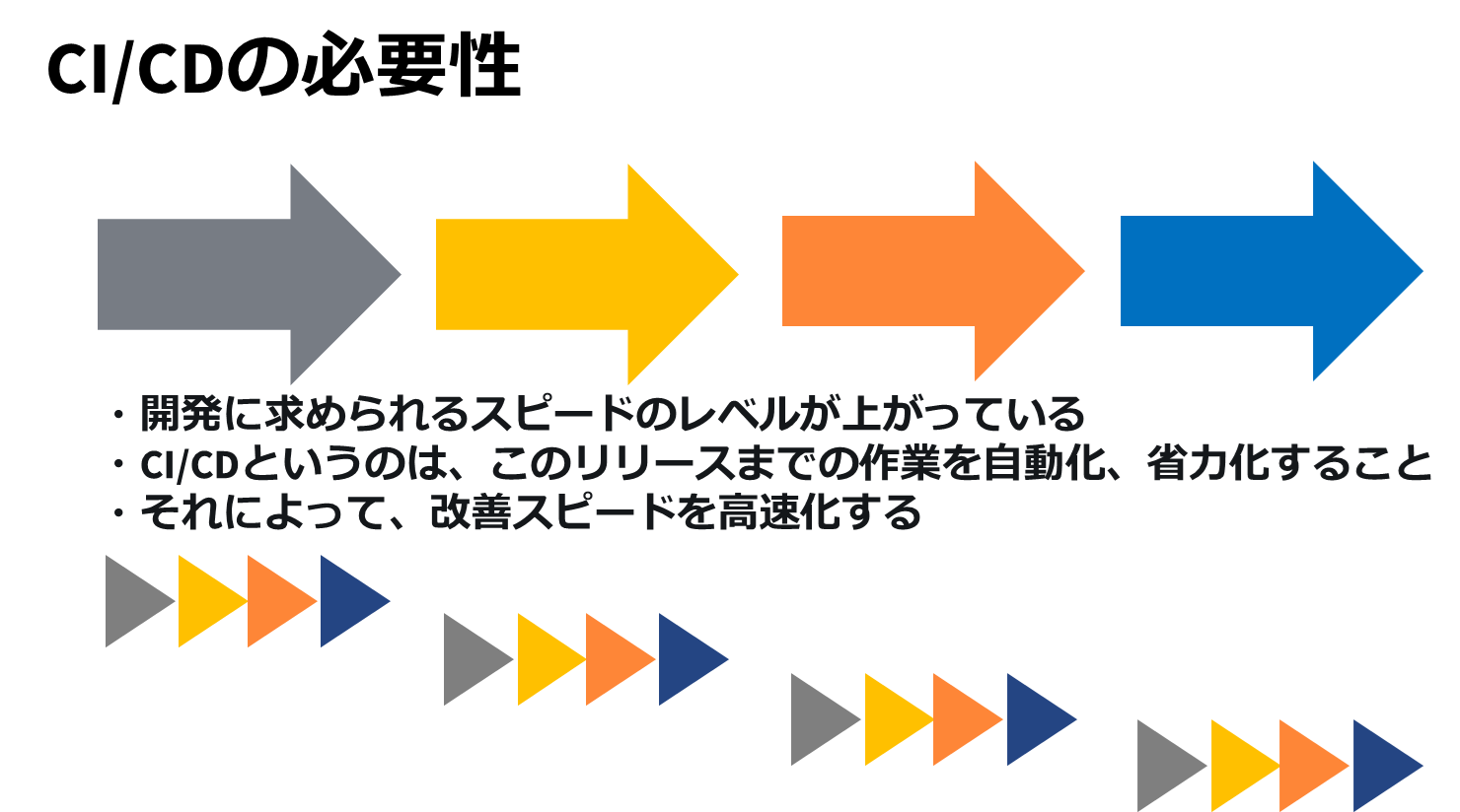 - 開発のスピード向上…手動で行っていたビルド、テスト、デプロイメントの作業を自動化することで、開発者はコードを書くことに集中できます。これにより、開発サイクルが短縮され、頻繁なリリースが可能になります。