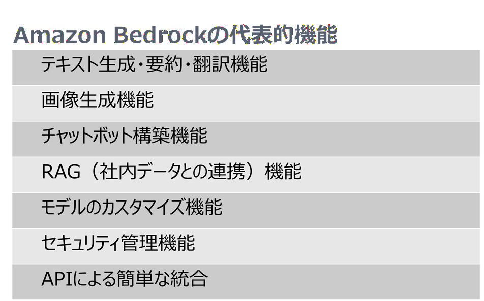 Amazon Bedrockでは、企業が生成AIを実装するための機能があらかじめ用意されています。ここでは代表的な機能を整理します。