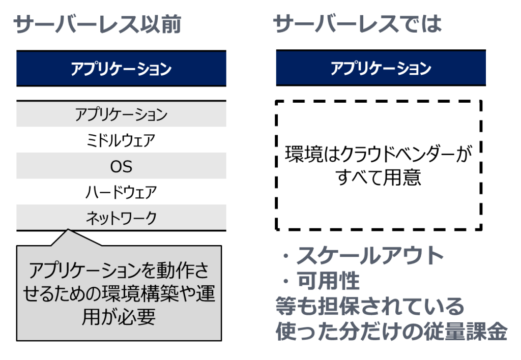サーバーレスシステムにおいてはこのような運用の大部分がAWSにより提供されるので、運用コストの削減をするだけでなく、人的リソースをアプリケーション開発に注力できます。