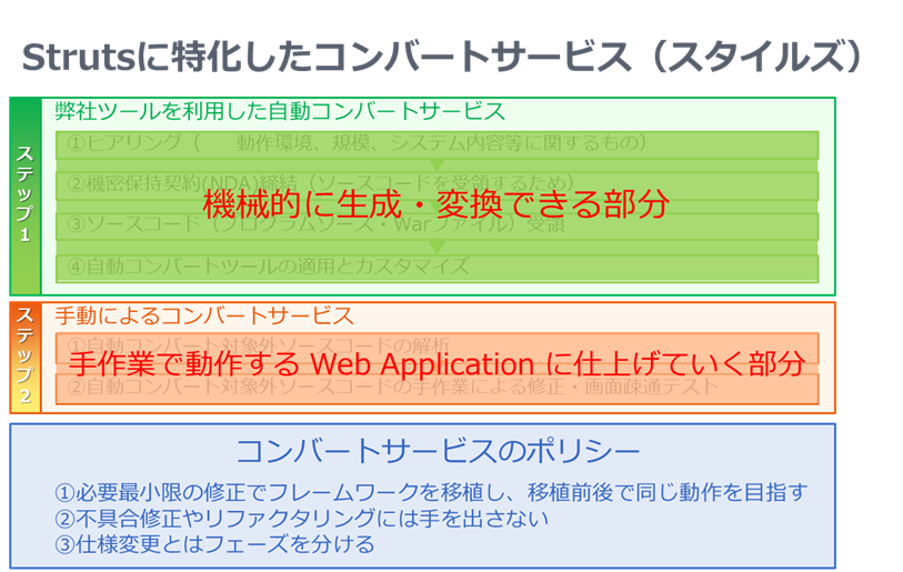 特定のルールに基づいて構成されたファイル(struts-config.xmlやActionクラスなど)を、ツールで一括変換します。 - ステップ2:手動仕上げ