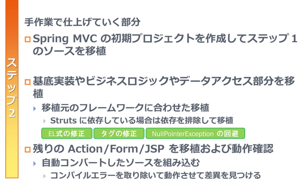 StrutsからSpringへの移行は、次の2ステップに分けて行うのが一般的です。